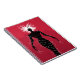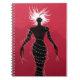 Un cuaderno de chica Demon con un ilustracion vector que representa a un extraño personaje femenino negro - un fantasma escalofriante con el pelo blanco, ojos malignos rojos y manos deformadas con largas uñas sobre fondo rojo. Este monstruo extraño lleva un vestido parecido a un alambre de púas con picos de vidrio.