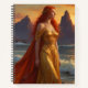 La diosa del amanecer emerge del mar con su vestido dorado y cabello rojo, iluminando el horizonte con su belleza y energía.