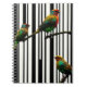 Tres pájaros vibrantes, multicolores, encaramados sobre una rama, ambientados sobre un llamativo fondo rayado en blanco y negro, creando un contraste audaz y un efecto visual artístico.