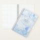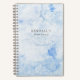 Elegante cuaderno con su nombre y descripción sobre un fondo de color azul a mano.