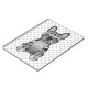 El original ilustracion personalizado de Destei de un lindo Bulldog azul marino francés / perro de raza francesa que está sentado. El fondo tiene un patrón de huellas de perros grises.