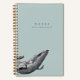 Un moderno cuaderno con temática gris y verde azul marino personalizado con un ilustracion acuarela de ballena jorobada sobre un fondo verde marino. Personalice su nombre con el tipo de letra serif gris. Es perfecto para los amantes de la vida marina