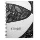 Este cuaderno temático de baloncesto presenta la imagen realista de una pelota de baloncesto abstractamente sobredimensionada que tiene paneles alternos negros y blancos con delicadas flores de doodle dibujadas a mano, plumas y paislies en los paneles negros de la pelota de baloncesto - personalizar con el nombre del atleta - por katz_d_zynes