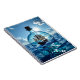 Un cuaderno temático sobre el océano. Un barco en una botella flotando en el mar. Un magnífico ilustracion aéreo para los amantes del deporte náutico.