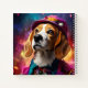 Un Beagle juguetón vestido con un disfraz vibrante y caprichoso contra un telón de fondo brillante y mágico. Este encantador diseño es perfecto para los amantes de los animales.