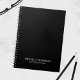 El bloc de notas profesional incluye el nombre personalizado y el texto en el estilo de fuente serif clásico blanco en el fondo negro.