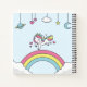 Un cuaderno lindo y personalizado con tu nombre en él. El arco iris es de estilo personalizado, con líneas rosas, amarillas y azules. Al final del arco iris hay dos nubes con y gris. Un unicornio blanco con cola y melena rosa, amarilla y azul salta sobre el arcoiris. Tiene mejillas rosadas y sonríe. A su alrededor hay corazones rosados. En la parte superior del diseño hay un planeta azul con anillo amarillo alrededor, dos corazones rosados, una nube blanca, una estrella amarilla y una luna azul colgando de las cuerdas negras. Bajo el arcoiris puedes escribir tu nombre.