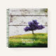 Cuaderno diario hecho en gráficos de una apariencia de valla de madera templada con obras de arte de un hermoso árbol morado en una colina verde. Personalice los dos campos de texto para leer lo que desee. Genial para todos tus pensamientos diarios.