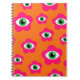 Cuaderno con una colorida cubierta retro: flores rosadas con ojos malvados en sus centros, con un vibrante fondo naranja. ¡Un gran regalo para los amantes de la retro!