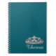 El bloc de notas se muestra en verde azulado con una copia impresa de la corona real y un nombre personalizado. Personalizar este artículo o compra tal cual.