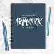 Una hermosa marina y un libro de dibujos en blanco personalizado de 8,5 x 11. Las palabras, "La obra de arte asombrosa de" en un tipo de letra dibujado a mano personalizado con tu nombre a continuación. Personalizar el cuaderno de bocetos con el nombre de tu elección para hacer que alguien se sienta especial. Hace un regalo divertido para cumpleaños o Navidades. Viene en una variedad de colores. Diseñado para ti por Blackberry Boulevard.