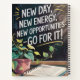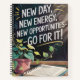 Un cuaderno enlazado en espiral - Inspirador Citas - con el diseño de un dibujo en tiza en un pizarrón muestra un cuaderno enlazado en espiral en primer plano, ligeramente abierto con sus páginas curvadas al lado de una vibrante planta tipo vid en una olla con tendriles que serpentean alrededor de los bordes del cuaderno, suaves rayos de luz solar que se derraman a través del pizarrón, arrojando un cálido brillo sobre el escenario, las palabras del nuevo "Nuevo día" nueva energía, nuevas oportunidades, ¡adelante!, escrito en negrita, en caricatura, con letras en globo con ramas de beige y negro resaltado recorriendo el texto redondeado, dándole profundidad y un ambiente lúdico, enérgico, rodeado de suaves tonos pastel en amarillo, verde azulado y rosa, creando una atmósfera inspiradora y motivadora.