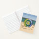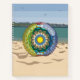 Esta mandala temática de la playa cuenta con capas de conchas, veleros, arena, sol, mar y palmeras dentro de una bola de playa transparente para recordar la diversión que viene con el verano. El balón de playa se encuentra en la arena, sobre un fondo de playa y océano.