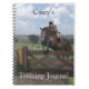 Este cuaderno presenta una obra de arte digital original de un caballo y montado sobre una puerta de granja, creada en Vue por el artista Jayne Wilson. El texto de la parte delantera del bloc de notas se puede personalizar.