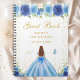 Este elegante y glamuroso libro de invitados para la fiesta de cumpleaños incluye una hermosa princesa con el pelo rojo marrón y piel clara en un vestido de bolas azules. El texto combina el guión manuscrito y las fuentes sans serif modernas para un aspecto elegante y sofisticado. Los arreglos florales, las mariposas y los confeti dorados crean una perfecta mezcla de rústico y moda. Gráficos de www.etsy.com/uk/shop/SunflowerDayLove