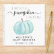 Un libro de invitados para niños pequeños con una acuarela azul pastel de una calabaza y "A Sweet Little Pumpkin Is On His Way" escrito en una mezcla de tipografía gris suave y un guión elegante con toques.