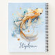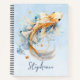 Este bonito cuaderno presenta una acuarela dorada, peces koi nadando en un fondo oscuro azul y personalizado con su nombre.