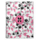 Este cuaderno de espiral temático del fútbol presenta un patrón de pelotas de fútbol rosadas, negras y blancas organizadas al azar, de diferentes tamaños, giradas de manera diferente en un fondo blanco - nombre del jugador y número de monograma o camiseta son personalizables - por katz_d_zynes