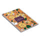 Brighten your day with this charming spiral notebook featuring a whimsical floral pattern on a vibrant orange background. The design showcases bold yellow flowers with dark purple and green accents, creating a lively and eye-catching aesthetic. A central purple label with a decorative border offers a space for a name or initial, elegantly presented in a flowing script font. This notebook is perfect for jotting down ideas, sketching, or organizing your thoughts in a style that's both cheerful and sophisticated. Embrace the beauty of nature with this unique and artistic design, making every note-taking session a delightful experience.