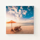 Esta foto muestra tumbonas, una sombrilla y un cielo azul sobre una playa de arena blanca.