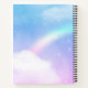 Un cuaderno de espiral personalizado con la imagen de un unicornio con grandes ojos azules, alas rosas y una forma y cola de arcoiris. Kawaii lindo.