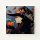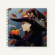Una guapa bruja de morena vestida de naranja, púrpura y negra. Dos amigos con ella... un pequeño ratón y una calabaza bebé que le miran de cerca. Las hojas del otoño caen a su alrededor.