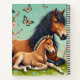 Caballo madre y su puerco descansando en un floreciente prado primaveral rodeado de mariposas. Una visión sentimental e idílica que evoca sentimientos de cuidado, armonía y la belleza de la renovación de la naturaleza.