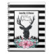 Planificador de bodas de cuaderno espiral personalizado u otra ocasión. Diseñado con una cabeza de ciervo negra con grandes cuerdas. Las líneas geométricas dentro de la cara del ciervo agregan un toque creativo. Flores rosas y coloridas hojas verdes de menta forman un ramo floral de bonito bajo su cabeza. Un sketch de cordillera colocado entre las flores también le da un toque rústico al campo. El fondo es un patrón rayado en blanco y negro.
