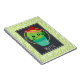 Un cuaderno de espiral personalizado con un bonito ilustracion de cactus, con grandes ojos de kawaii y sombrero rojo. El fondo es una imagen de pizarra colocada encima de un patrón de remolinos verde cal.