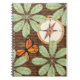 Caderno com estampa de madeira, folhas, bússola e borboleta monarca. Estampa de natureza adiciona um toque rústico e clássico, contrastando de maneira elegante com as estampas de folhas.