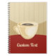 Ilustracion beige de café sobre mesa roja con texto personalizado.