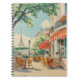 Un encantador ilustracion de estilo vintage de una soleada terraza de café de París con sillas de mimbre, toldos de rayas rojas y vistas a la Torre Eiffel. El ambiente retro y acogedor de los años 50 lo convierten en un lugar perfecto para una decoración nostálgica o temática de viaje.