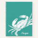 Portátil azul Guay impreso con un diseño de cangrejo de aspecto angustiado. En la parte delantera hay un gran cangrejo y espacio para añadir tu nombre. Simplemente golpea al PERSONALIZAR y cambia el texto para que se adapte. En la parte trasera del cuaderno hay un patrón de cangrejos de aspecto caprichoso. Un cuaderno con huellas de mariscos azules y blancos. Portátiles náuticos.