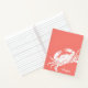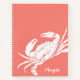 notebook rosa de coral bonito impreso con su apariencia angustiada de cangrejos. En la parte delantera hay un gran cangrejo y espacio para añadir tu nombre. Simplemente golpea al PERSONALIZAR y cambia el texto para que se adapte. En la parte trasera del cuaderno hay un patrón de cangrejos de aspecto caprichoso. Portátil de impresión de marisco blanco y rosa de coral. Cuaderno náutico.