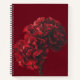 Bloc de notas con un fondo rojo oscuro, burdeos y bonitas flores de clavel rojas.