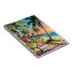Un hermoso cuaderno personalizado con una ilustración de un paraíso tropical junto al mar de un paseo marítimo a lo largo de la costa, con palmeras con cocos y luces de hadas colgadas, olas del océano azul y pequeñas cabañas caprichosas.