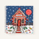 Un ilustracion colorido de una casa de jengibre festiva. El exterior de la casa está decorado con dos latas de caramelo y tiene un gran árbol de langosta en el jardín. El suelo está cubierto de una brillante nieve de azúcar blanca de hielo y repleto de dulces.