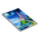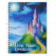 Cuaderno en un castillo en la cima de una colina con una carretera que conduce a la puerta, y un cielo nocturno con luna llena y estrellas. El texto le recuerda que "siga sus sueños".