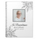 Invite a los huéspedes a dejar una nota en recuerdo de su ser querido después de su paso con el elegante libro de invitados de la Celebración de los copos de nieve del funeral de la vida. Este elegante cuaderno de homenaje al invierno personalizado presenta intrincados copos de nieve grises que adornan las esquinas con un fondo blanco. Personalízalo con fecha de nacimiento y muerte, nombre e imagen.