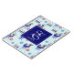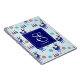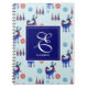 Un cuaderno en espiral con un patrón de repetición. Ilustrado con un par de ciervos escandinavos azules con pañuelos rojos. Con marcas decorativas en sus cuerpos. Además de un trío de navidades rojas y azules con una estrella en la parte superior. Unos flamencos de nieve esparcidos por todos lados. Un cuadrado sobre la parte superior con tu monograma personalizado inicial y nombre.