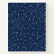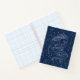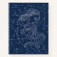 Aquarius zodiac firma ilustracion gráfico con estrellas y constelaciones sobre un fondo azul marino. En la parte trasera del cuaderno hay un patrón de constelaciones de cielo nocturno.