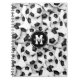 Este bloc de notas en espiral con temática de fútbol para niños o chicas presenta un patrón de pelotas de fútbol blancas y negras arregladas al azar en diferentes tamaños giradas de manera diferente en un fondo blanco - nombre del jugador y número de monograma o camiseta son personalizable - por katz_d_zynes