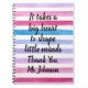 "Se necesita un gran corazón para dar forma a las mentes pequeñas" cuaderno personalizado para la Apreciación del Profesor. Combinando franjas acuáticas coloridas con una cita inspiradora en la tipografía de guiones, este bloc de notas se puede personalizar para agregar el nombre de su profesor favorito. Excelente como regalo para un profesor, asistente de profesores, entrenador, profesor de educación especial para volver a la escuela, vacaciones o como regalo de fin de año Gracias regalo. ©TeacherTribeMerch