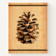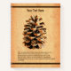 Una representación digital de un cono de pino de Mamáes'alot-Tarshiha en el norte de Israel, Galilee, superpuesta sobre un fondo de papel antiguo, junto con la cita: "Pocos son totalmente sordos a la prédica de los pinos. Sus sermones sobre las montañas llegan a nuestros corazones; y si la gente en general pudiera ser llevada al bosque, incluso por una vez, para escuchar a los árboles hablar por sí mismos, todas las dificultades en el camino de la preservación de los bosques se desvanecerían". -John Muir, naturalista, explorador y escritor (1838-1914). También hay un lugar para agregar su propio texto adicional. El Pino de Alepo (Pinus halpensis), también conocido como el Pino de Jerusalén, es la única especie de pino silvestre que crece en Israel. Es comúnmente aceptado que el árbol ahora llamado "pino" es el "árbol petrolero" bíblico, como se menciona en Isaiah XLI, 19: "Plantaré en el desierto el cedro, el árbol de acacia, el mirto y el árbol de óleo..." También se menciona en I Reyes VI, 23: "Y dentro del santuario hizo dos grifos de petróleo, cada diez codos de alto." El árbol del petróleo también se menciona en los versos 31 y 33 del mismo capítulo, así como en Nechemia VIII, 15. El árbol del petróleo se caracteriza cerca de otros árboles impresionantes en la descripción de la visión de la redención, en el florecimiento del desierto y la tierra árida. En la Mishnah y en otras literaturas rabínicas, el árbol del petróleo se menciona como un árbol que fue usado para encender las balizas que fueron iluminadas para anunciar un nuevo mes. El pino, en su nombre actual, se menciona en la Biblia una vez, en el Libro de Isaías XLIV, 14: "... y toma el ciprés y el roble, que él se fortalece entre los árboles del bosque; planta un pino, y la lluvia lo nutre". En el Mishnah se mencionan los pinos en el marco de los árboles que se utilizaron para quemar el "heifer rojo". También están los que sostienen que los pinos estuvieron entre los árboles usados para encender las balizas para anunciar un nuevo mes. El pino de Alepo florece y florece en primavera. Los conos machos se derraman después de la floración mientras que los conos hembra se convierten en fruta. El cono permanece cerrado en el árbol hasta que un pesado sharav [hamsin], cuando se abre y sus semillas están esparcidas.