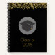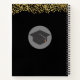 Un cuaderno en espiral que dice: Clase de 20xx. Diseñado con un falso purpurina de confeti de oro. Fijado sobre un fondo negro. Ilustrado con una tapa de graduación negra con un círculo semitransparente detrás. Elegante y moda.