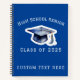 Personalice tres líneas de texto blanco en este bloc de notas azul oscuro de clase secundaria de 2025. Ya sea que su hijo empiece la escuela secundaria, secundaria, universidad o que quiera agregar el nombre de la escuela y otra frase personalizado, puede hacerlo por encima y por debajo de la capa azul y el tassel.