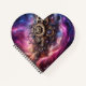 Esta vibrante fantasía industrial de vapor de relojes diseño en llamas rosa y morado a través de una nebulosa llena de estrellas en el cielo nocturno.
