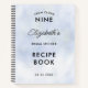 Un elegante libro de recetas de ducha de novia con el tema Cloud 9, con un fondo de cielo azul pastel, caligrafía de escritura moderna y tipografía simple, limpia y moderna.