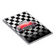 Personaliza el nombre en blanco con coche deportivo rojo sobre fondo ajedrezado en blanco y negro.