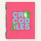 Dos cocodrilos divertidos y voraces sentados alrededor de las letras CRO-COD-ILES. Un diseño divertido con colores vivos y brillantes para cualquier amante de los animales reptilianos.